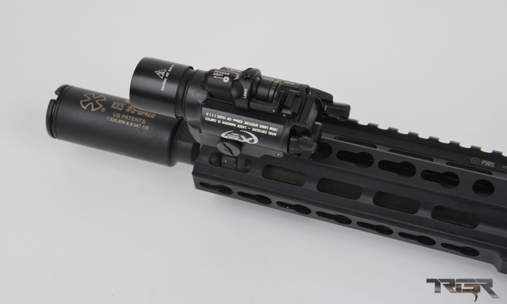 Small guns are good for CQB stuff like room clearing. Indoors often means dark and you must positively identify any target before engaging. We really have been liking the Surefire 400X Ultra Green shown here on our MK107. The 400X Ultra has a super bright 500 lumen LED beam that can dazzle, giving you a tactical advantage in the dark. The light also has a 5 mw green laser to assist in aiming, particularly useful in unconventional positions. Despite its high power the 400X can run for 1.5 hours at full output on a set of batteries. The light body is hard anodized billet aluminum and is waterproof with o-ring seals. What we really like about the 400X ultra is that it is small, lightweight and compact, especially considering it’s output. What we don’t like is the cost. This sucker will set you back more than a lot of guns like a complete Del-Ton!
