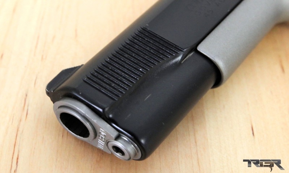Another common old school trick is dehorning. This is rounding off all of the guns sharp corners and edges particularly in the front of the gun. Look how smooth the front of the slide and frame are. This makes holstering the gun a lot smoother and it just plain looks cool. I had front cocking serrations added about the time of the ejection port mods. I am a big fan of front cocking serrations on all pistols because I am an advocate of doing a press check. You can see how thick the front of the Wilson Combat heavy duty Bulletproof front bushing is.